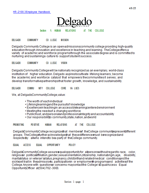 Version 9 HR-2100.3 Employee Handbook: Section 1 - Human Relations at the College