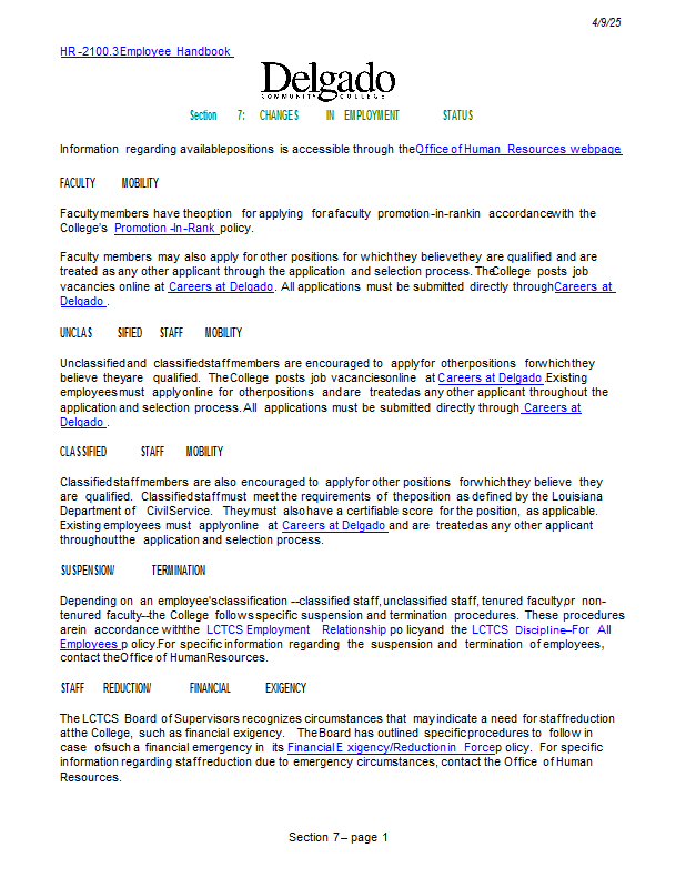 Version 7 HR-2100.3 Employee Handbook: Section 7 - Changes in Employment Status