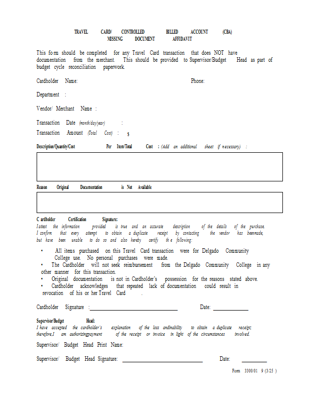 Version 1 Travel Card/CBA Missing Document Affidavit Form (Form 3300/019)