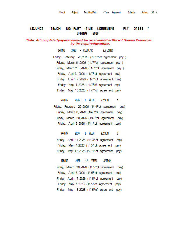 Version 1 Payroll Calendar - Adjunct Teaching Part-time Agreement Payroll Calendar SPRING 2026